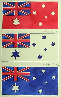 - ↑ Zdaniem byłego premiera Australii Gough Whitlama, wybór w 1953 roku niebieskiego wariantu flagi spowodowany był przede wszystkim osobistą niechęcią ówczesnego szefa gabinetu federalnego, Roberta Menziesa do czerwonej bandery, która mogła kojarzyć się z komunistycznym sztandarem[22][20].