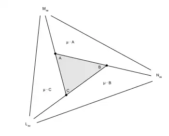 Trójkąt o skończonych bokach można uzupełnić do trójkąta potrójnie asymptotycznego, przedłużając jego boki w porządku cyklicznym. Trójkąt potrójnie asymptotyczny jest wtedy sumą trójkąta skończonego ABC i trzech trójkątów podwójnie asymptotycznych: