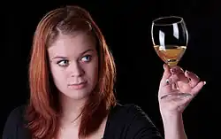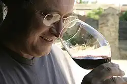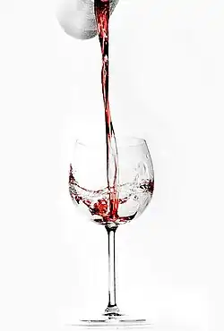 - powąchanie wina. W celu uwolnienia aromatów z powierzchni płynu można zakręcić winem w kieliszku. Najlepiej jest, gdy kieliszek trzyma się za nóżkę (dzięki temu nie ogrzeje go ciepło dłoni), a wino nalane jest nie więcej niż do połowy (względnie do jednej trzeciej lub nawet jednej czwartej w przypadku dużych kieliszków[6]). Kolejne wciągnięcie powietrza nosem można wykonać, wtykając nos głębiej do kieliszka.