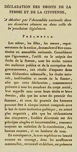 Deklaracja praw człowieka i obywatela została przyjęta w 1789 roku przez Konstytuantę podczas rewolucji francuskiej. Deklaracja przygotowana i przedstawiona przez markiza de Lafayette stwierdzała, że wszyscy mężczyźni „rodzą się i pozostają wolni i równi w prawach” oraz że te prawa są uniwersalne. Stała się kluczowym dokumentem praw człowieka ujmującym stosunek pomiędzy jednostką a państwem[1]. Deklaracja demaskowała nierówność praw obywateli ze względu na płeć, rasę, klasę i religię[2]. Artykuły nowej konstytucji francuskiej przyjętej w 1791 rozszerzały prawa obywatelskie i polityczne na wszystkich obywateli (w tym protestantów i Żydów, uprzednio dyskryminowanych)[1]. W 1790 roku Nicolas de Condorcet i Etta Palm d’Aelders wzywali Konstytuantę do rozszerzenia praw obywatelskich i politycznych na kobiety, ale bez powodzenia[2]. Condorcet zadeklarował, że „ten, kto głosuje przeciwko prawom innej osoby, niezależnie od tego czy ze względu na religię, kolor, płeć czy inne cechy tej osoby, tym samym podważa własne prawa”[1]. Ponieważ władze rewolucyjne nie zamierzały rozszerzyć praw człowieka na kobiety, we wrześniu 1791 roku de Gouges opublikowała Deklarację praw kobiety i obywatelki[3].