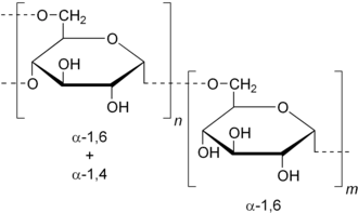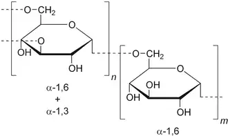 Dekstrany zbudowane są z reszt D-glukopiranozy, tworzących układ rozgałęzionego polimeru. W łańcuchach głównych znajdują się zazwyczaj wiązania α-1,6-glikozydowe, a łańcuchy boczne przyłączone są poprzez wiązania α-1,2-, α-1,3- lub α-1,4-glikozydowe. Grupy boczne to w większości jedna lub dwie reszty glukozy, jednak długość niektórych łańcuchów bocznych dochodzi do 30–50 jednostek cukrowych. Mniej liczne dekstrany, zwane alternanami, zawierają w łańcuchu głównym naprzemiennie wiązania α-1,3- i α-1,6-glikozydowe. Znane są także dekstrany-mutanty, w których reszty glukozy w łańcuchu głównym połączone są wiązaniami α-1,3-glikozydowymi, a łańcuchy boczne przyłączone są przez wiązania α-1,6-glikozydowe[1].