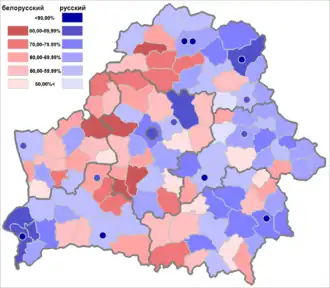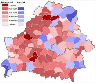 Wyniki spisu powszechnego z 2009 roku mówią o tym, iż w kontaktach domowych większość ludności zwykle posługuje się językiem rosyjskim (6 672 964 osoby, co stanowi 70,21% ludności). Przede wszystkim językiem białoruskim posługuje się w kontaktach domowych 2 227 175 osób, co stanowi 23,43% ludności kraju[27]. Równocześnie z rezultatów spisu wynika, iż dla większości mieszkańców Białorusi językiem ojczystym jest język białoruski (deklarację taką złożyło 5 058 402 osób, co stanowi 57,96% ludności kraju). Język rosyjski jest ojczystym dla 3 948 074 osób (41,54%)[27].