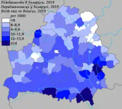 Najwyższy współczynnik urodzeń zanotowano w 2012 w obwodzie brzeskim (13,1), najniższy zaś – w obwodzie witebskim (10,9)[19]. Obwód witebski cechował się w tym czasie również największym współczynnikiem zgonów (15,4 przy najniższym współczynniku o wartości 9,2 w Mińsku)[19].