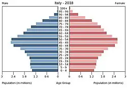 Kraj znajduje się w zaawansowanej fazie transformacji demograficznej i ma typowe cechy demograficzne dla krajów wysoko rozwiniętych. Oznakami tego są bardzo zaawansowane starzenie się populacji i niski współczynnik dzietności. Średni wiek populacji wzrósł do 45,7 lat[1] i tym samym Włochy są drugim najstarszym społeczeństwem na świecie[7].