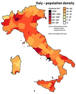Na początku 2020 roku Włochy miały 60,3 mln mieszkańców[1]. Gęstość zaludnienia, wynosząca 201 mieszkańców na 1 km² jest wyższa niż w większości krajów Europy Zachodniej. Jednak rozkład populacji zasadniczo jest nierównomierny. Najbardziej zaludnione są Nizina Padańska na północy kraju, oraz obszary metropolitalne Mediolanu, Rzymu i Neapolu. Najsłabiej zaludnione są prowincja Basilicata, obszary górzyste Alp i Apenin, oraz wyspa Sardynia[2].