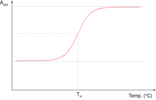 Wzrost temperatury DNA destabilizuje podwójną helisę, wywołując rozdzielenie nici. Ciepło zaburza zarówno wiązania wodorowe, jak i powłokę hydratacyjną, prowadząc do zmniejszenia sił utrzymujących obie nici razem. Eksperymentalnie stwierdzono liniową zależność między zawartością G+C a temperaturą rozdzielenia się nici DNA (rozdzielenie pary GC wymaga zerwania trzech wiązań wodorowych, a pary AT tylko dwóch). Temperatura ta jest wyższa dla dłuższych dupleksów; zależy także od modyfikacji obecnych w resztach nukleotydowych (które w zależności od swojego charakteru mogą ją podwyższać lub obniżać). Temperaturę, w której 50% składu próbki DNA ulega denaturacji, nazywa się temperaturą topnienia DNA (lub temperaturą mięknięcia DNA), Tm (taki sam parametr określa się dla dupleksów innych kwasów nukleinowych, na przykład RNA:RNA lub RNA:DNA).