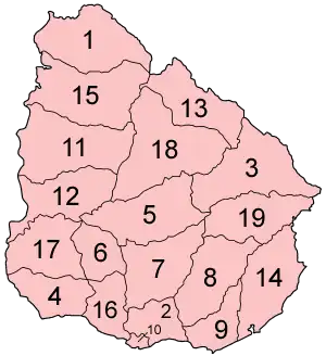 Urugwaj dzieli się obecnie na 19 departamentów (departamentos). Podział ten kształtował się przez cały XIX wiek. Początkowo w 1816 wydzielono 6 departamentów. Później wydzielano kolejne aż do 1885, kiedy powstał ostatni departament Flores.