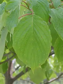 - Eliptyczne i skrętoległe (wyjątkowo wśród dereni), barwy zielonej (kultywar 'Variegata' ma liście pasiaste). Jesienią przebarwiają się na kolor czerwony lub puprupurowy.