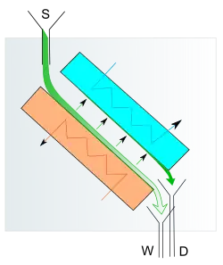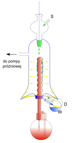 Dwie powierzchnie – ogrzewana i chłodzona – znajdują się w przestrzeni o ciśnieniu rzędu 10−5 hPa w odległości zbliżonej do długości średniej drogi swobodnej oddestylowywanego składnika; S – surówka, D – destylat, W – ciecz wyczerpana