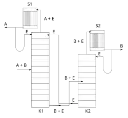 Najprostszym przypadkiem jest rozdzielanie mieszaniny dwóch składników o podobnej lotności (A i B) z użyciem czynnika rozdzielającego (E, ”ekstrahent”). Na środkowe półki kolumny pierwszej jest wprowadzana rozdzielana mieszanina A+B, a na górne półki – czynnik rozdzielający E. Ponieważ jest on trudno lotny, odparowuje w minimalnym stopniu, a powoduje zwiększenie lotności składnika A, którego pary wędrują na wyższe półki, a następnie do wylotowego skraplacza.