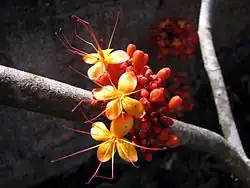 - Zwykle drewniejące i pękające strąki, rzadziej niepękające, w typie skrzydlaków[4]. Nasiona wielu rodzajów mają jaskrawą osnówkę (przystosowanie do ornitochorii)[8].