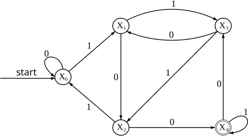 Zbudujmy na przykład maszynę rozpoznającą takie słowa nad alfabetem binarnym (reprezentujące liczby, przy najbardziej znaczącej z lewej strony), które są podzielne przez 5.
