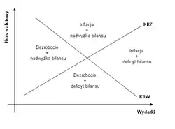 Oś pozioma reprezentuje całkowitą sumę wydatków w danym kraju na konsumpcję, inwestycje oraz wydatki rządowe. Oś pionowa reprezentuje poziom kursu walutowego. Na wykresie wyznaczono również dwie krzywe: krzywą równowagi wewnętrznej (KRW) oraz krzywą równowagi zewnętrznej (KRZ). Krzywa równowagi wewnętrznej łączy punkty będące taką kombinacją wydatków i kursu walutowego, która pozwala utrzymać w gospodarce równowagę wewnętrzną (brak bezrobocia i inflacji). Wszystkie punkty poniżej tej krzywej oznaczają bezrobocie, a powyżej inflację. Krzywa równowagi zewnętrznej łączy punkty będące kombinacją kursu walutowego i wydatków, która oznacza dla gospodarki równowagę zewnętrzną (zrównoważony bilans płatniczy). Punkty poniżej te krzywej oznaczają deficyt bilansu płatniczego, natomiast powyżej nadwyżkę bilansu płatniczego, obydwa te stany w długim okresie są niepożądane.