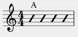 Zapisując dany akord na pięciolinii zamiast umieszczania postrzegalnych nut, można posłużyć się belkami rytmicznymi (rys. 3). Nad pięciolinią należy umieścić nazwę granego akordu, a na niej taką liczbę belek, jaką należy zagrać dany akord (w tym wypadku należy cztery razy zagrać akord A-dur).