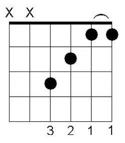 - gruba pozioma linia przedstawia siodełko gitary; jeżeli akord jest opalcowywany od wyższego progu (powyżej trzeciego) nie rysuje się siodełka, a zamiast niego po prawej stronie diagramu na wysokości pierwszej i drugiej poziomej linii (licząc od góry) podaje się numer progu, który jest reprezentowany przez pierwszą poziomą linię