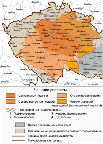 Dialekt czesko-morawski jest typu przejściowego z racji swojego położenia na pograniczu obszarów dialektów czeskich właściwych i dialektów morawskich, w szczególności dialektu hanackiego (środkowomorawskiego)[4].