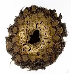 - Zebrane są w kuliste lub owalne kupki zarodni (sori) tworzące się na końcach żyłek przewodzących na skraju odcinków liścia, na ich dolnej stronie[7][13]. Kupki zarodni chronione są przez zawijający się nad nimi brzeg liścia oraz błoniastą zawijkę[13], charakterystyczną ze względu na to, że jest dwuczęściowa, asymetryczna, położona bocznie i ma formę miseczkowatą[7]. Zarodnie mają cienkie ścianki[7] i wyrastają na wypukłości, utworzonej przez tkankę liścia, zwanej łożyskiem[13].