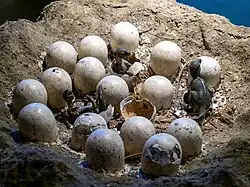 Andrew H. Lee, S Werning. Sexual maturity in growing dinosaurs does not fit reptilian growth models. „Proceedings of the National Academy of Sciences”. 105 (2), s. 582–587, 2008. DOI: 10.1073/pnas.0708903105. PMID: 18195356. PMCID: PMC2206579. Bibcode: 2008PNAS..105..582L. - ↑ J.R. Horner, Robert Makela. Nest of juveniles provides evidence of family structure among dinosaurs. „Nature”. 282 (5736), s. 296–298, 1979. DOI: 10.1038/282296a0. Bibcode: 1979Natur.282..296H.