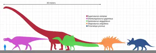 Dinozaury to z taksonomicznego, morfologicznego i ekologicznego punktu widzenia zróżnicowana grupa zwierząt. Do ptaków zaliczanych jest obecnie ponad 10 000 gatunków[15], co czyni je najbardziej zróżnicowaną grupą kręgowców z wyjątkiem okoniokształtnych[a][16]. Dzięki dowodom kopalnym do 2006 paleontolodzy wyróżnili ponad 500 rodzajów[17] i ponad tysiąc gatunków nieptasich dinozaurów[18], podczas gdy w 2014 liczba opisanych rodzajów wynosiła 943[19]. Dinozaury zamieszkiwały wszystkie kontynenty – na wszystkich bowiem znajdowane są ich szczątki kopalne, jak i występują współczesne gatunki[20]. Zaliczają się do nich zarówno roślinożercy, jak i mięsożercy. Pierwotnie cechowała je dwunożność, ale wiele wymarłych grup obejmowało formy czworonożne, a także poruszające się zarówno na dwóch, jak i na czterech łapach. Liczne grupy wykształciły wyszukane struktury, jak rogi czy kryzy. Niektóre taksony wymarłe wykształcały także takie modyfikacje szkieletu, jak kolce czy pancerz. Potwierdzono składanie jaj i budowę gniazd u wszystkich grup. O ile dzisiejsze ptaki osiągają zazwyczaj niewielkie rozmiary, co wiąże się z umiejętnością lotu, formy prehistoryczne osiągały często duże rozmiary. Największe zauropody mogły osiągać nawet 58 m długości przy wysokości 9,25 m[21]. Wizja nieptasich dinozaurów jako jednorodnie gigantycznych jest jednak nieprawdziwa, wynika z większej tendencji do zachowywania się dużych kości. Wiele nieptasich dinozaurów było niewielkich rozmiarów, jak mierzący około 50 cm długości Xixianykus.