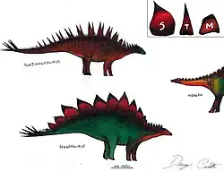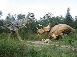 ![]() Przedstawiciele różnych grup dinozaurów: na górze Gastonia burgei i Triceratops horridus, w środku wróbel zwyczajny i Stegosaurus stenops, na dole Edmontosaurus regalis i Apatosaurus louisae | |||