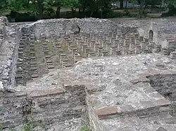 - termy rzymskie, zajmujące powierzchnię ok. 4000 m², które wyposażone były w baseny, sauny, sale masażu, bibliotekę, miejsca do spotkań publicznych, sale do modlitw i odeon, na podłogach których można podziwiać obecnie kamienne mozaiki z treściami mitologicznymi,