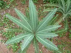 - Zróżnicowane na liście łuskowate i asymilacyjne[12]. Liście asymilacyjne wyrastają skrętolegle na szczycie pędu, tworząc na nim pióropusz. Są pierzasto, pojedynczo złożone[12]. Osiągają zazwyczaj od 1 do 2 m długości i od 7,5 do 20 cm szerokości. U większości gatunków są proste i sztywne, rzadziej są bardziej giętkie i w efekcie łukowato wygięte. Barwa liści jest sinozielona do zielonej, matowa do błyszczącej. Listki u części gatunków są względem osi liścia płasko rozpostarte, u innych mniej lub bardziej wzniesione. Listki są całobrzegie (większość gatunków ze wschodnich wybrzeży Meksyku) lub są na szczycie ząbkowane lub kolczaste (wszystkie występujące wzdłuż zachodniego wybrzeża Meksyku). Poszczególne liście utrzymują się na ogół przez ok. cztery lata i zwykle na roślinach jest ich kilkanaście. U niektórych wolno rosnących gatunków kolejny liść rozwija się co dwa–trzy lata[8].