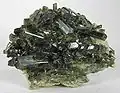 Zazwyczaj tworzy kryształy o pokroju słupkowym, o prawie kwadratowym przekroju. Często tworzy zbliźniaczenia. Występuje w skupieniach ziarnistych, zbitych, skorupowych, pręcikowych, igiełkowych. Piękne kryształy spotykane są w druzach i szczelinach, gdzie tworzą szczotki krystaliczne. Jest kruchy, przezroczysty. Z hedenbergitem tworzy kryształy mieszane – szereg izomorficzny