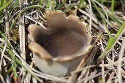 Typu apotecjum o szerokości 1,5–4 cm, siedzący lub z krótkim trzonem, o kształcie urny lub miseczki. U starszych okazów często brzeg gwiaździście pęka. Powierzchnia hymenialna (wewnętrzna) matowa, szarobrązowa do czarnobrązowej, naga, powierzchnia zewnętrzna u podstawy biaława, matowoszara do czarnobrązowej, powyżej delikatnie owłosiona (widoczne dopiero porzez lupę). Trzon, jeśli jest, to bardzo krótki, składający się z białawych fałd lub tępych żeber. Miąższ cienki, kruchy, o grubości około 1,0 mm, dwuwarstwowy, wodnistoszary i białawy o łagodnym zapachu i smaku[3].