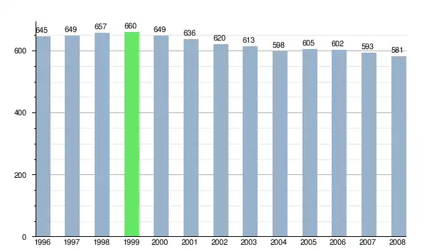 Według danych z dnia 31 grudnia 2012, wieś zamieszkiwało 569 osób, w tym 296 kobiet i 273 mężczyzn[7].