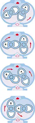 W technologii dmuchaw Rootsa, zastosowane są zazwyczaj dwa wirniki tłokowe, które obracając się wewnątrz obudowy, zasysają dawkę powietrza do komory kompresji, by następnie wypchnąć ją do otworu wylotowego. Ciśnienie powietrza podczas procesu pozostaje stałe aż do momentu odsłonięcia otworu wylotowego przez tłoki rotacyjne. Część powietrza przepływa z powrotem do komory sprężania, zwiększając ciśnienie i zmniejszając objętość w zamkniętej przestrzeni. Wirniki tłokowe obracają się dalej aż do momentu wypchnięcia powietrza z przestrzeni obudowy. Sprężanie ma miejsce przy pełnym przeciwciśnieniu na zewnątrz obudowy[2].