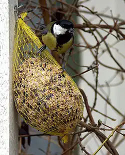 - Wisząca siatka wypełniona ziarnami czy orzechami, sypkimi lub zlepionymi tłuszczem w kulę.