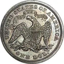 W centralnym punkcie rewersu znajdował się orzeł z rozpostartymi skrzydłami. W szponach strzały i gałązka oliwna. Na piersi orła Union Shield. Nad orłem wybito nazwę państwa „UNITED STATES OF AMERICA”, a pod orłem nominał i waltuę w skróconym zapisie „ONE DOL.”[21].