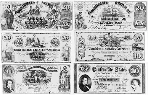 Ponieważ zdecydowana większość gotowych miedziorytów i matryc do produkcji banknotów pozostała na Północy, konfederaci zmuszeni byli drukować banknoty używając takich wzorów, jakie mieli do dyspozycji. Emisje różniły się między sobą nie tylko wzorami, ale także rodzajem papieru, na jakim zostały wydrukowane, z powodu braków w zaopatrzeniu spowodowanych blokadą portów w wyniku nałożonego przez Unię embarga.