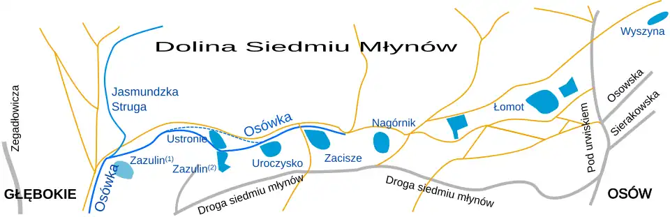 Dolina obejmuje fragment górnego biegu Osówki, położony między willową dzielnicą Głębokie i osiedlem Osów[5]. W tej części swojego biegu struga zasila (przepływając częściowo kanałami podziemnymi) co najmniej 9 małych zbiorników wodnych[2], w tym sześć byłych stawów młyńskich: Zazulin, Ustronie, Zacisze, Uroczysko, Nagórnik i Łomot[3][2]).