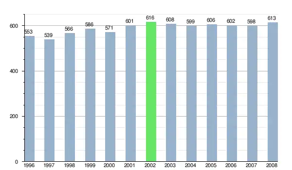 Według danych z dnia 31 grudnia 2012 roku, wieś zamieszkiwało 601 osób, w tym 314 kobiet i 287 mężczyzn[6].