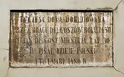 - ↑ Polkowski 1880 ↓, s. 11 przytacza go w innym brzmieniu: Tę część domu roku 1450 dobudował Jan Długosz, w domu tym mieszkał lat 30, tu pisał dzieje Polski i tu dokonał żywota swego.