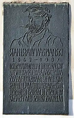 - ↑ Błędną informację, że tablica poświęcona jest jego ojcu, Franciszkowi Wyspiańskiemu podaje Encyklopedia Krakowa 2000 ↓, s. 156, 1072 (hasło: Wyspiański Franciszek). Jednak w innym miejscu tej samej pracy stwierdza się, że upamiętnia Stanisława, Encyklopedia Krakowa 2000 ↓, s. 978 (hasło: Tablice pamiątkowe).