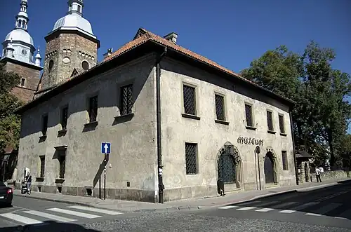 Jest to obiekt złożony z dwóch jednopiętrowych bloków, murowany, częściowo oszkarpowany i podpiwniczony. Każdy z bloków nakryty jest osobnym dachem. Portale i obramienia okien są późnogotyckie, renesansowe i barokowe[1]. W południowej elewacji zachował się późnogotycki portal z 1505 roku, z licznymi rozetkami (wpływ renesansu)[2]. Drugi portal późnogotycki został odnaleziony w gruzie koło kolegiaty w 1907 r. i w 1913 roku umieszczony w fasadzie kamienicy[2]. Na parterze północnej fasady znajduje się okno z obramieniem i inskrypcją INRI i datą 1525. Obramienie to porównywane z warsztatami rodem ze słowackiego Bardiowa i Sabinowa[2].