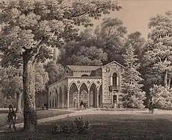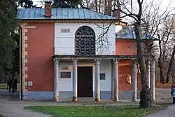 Główne wejście znajduje się w ścianie wschodniej pod arkadami. Do wnętrza prowadziły drzwi żelazne, nad którymi na marmurowej tablicy widniały dwa napisy – fragment Eneidy Wergiliusza[3] (Śunt lacrimae rerum et mentem mortalia tangunt – I pamiątki łzy wyciskają i znikome rzeczy duszę rozczulają) i wiersz Delille'a w języku francuskim z tłumaczeniem: