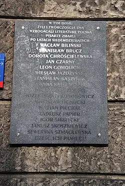 - przy al. T. Kościuszki 98: Wacław Biliński, Krystyna Bilska, Stanisław Brucz, Dorota Chróścielewska, Honorata Chrościelewska, Tadeusz Chrościelewski, Jan Czarny, Ariadna Demowska, Ryszard Doroba, Wojciech Drygas, Bolesław Dudziński, Leon Gomolicki, Jan Huszcza, Wiesław Jażdżyński, Zygmunt Kałużyński, Anna Kamieńska, Wanda Karczewska, Stanisław Kaszyński, Józef Maciej Kononowicz, Maciej Rymwid Kononowicz, Jan Koprowski, Lucyna Krzemieniecka, Stanisław Jerzy Lec, Zofia Lorentz, Andrzej Mikołajewski, Jerzy Miller, Mirosław Ochocki, Andrzej Ostoja-Owsiany, Ewa Ostrowska, Tadeusz Papier, Tadeusz Peiper, Leon Pasternak, Marian Piechal, Anna Pogonowska-Oplustil, Jerzy Rożniecki, Adolf Rudnicki, Horacy Safrin, Igor Sikirycki, Janusz Skoszkiewicz, Włodzimierz Słobodnik, Seweryna Szmaglewska, Edward Szuster, Adam Ważyk,