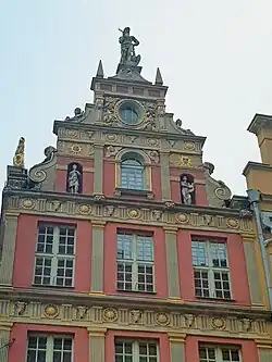 Fasadę kamienicy opinają pilastry na całej wysokości, jednakże w kompozycji całości ostrzej zaznaczają się horyzontalne linie gzymsów, obramiających wręcz klasyczne fryzy z tryglifami, metopami i bukranionami. Figury we wnękach, putto na wolutach szczytu, zdobna lukarna i wreszcie okazały portal tworzą pałacową oprawę frontu. Rzeźbiarski wystrój kamienicy został odtworzony przez zespół gdańskich artystów. W 1912 roku część wystroju sieni, którą zaadaptowano na kawiarnię, przeniesiono do Ratusza Staromiejskiego[2].