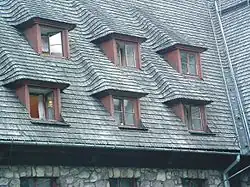 Utrzymany w stylu nowozakopiańskim ma bryłę czworościanu z dziedzińcem wewnątrz. Powierzchnia gontowego dachu wynosiła 6000 m²[2].