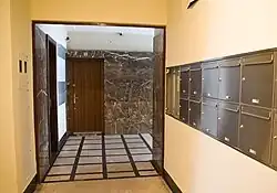Wnętrze zasadniczo dwutraktowe o układzie zachowanym w niemal niezmienionej formie od momentu wybudowania. Klatka schodowa zlokalizowana w części centralnej z pionem windy od zachodu. Dobrze zachowana, o ścianach obłożonych płytami z szarego i białego marmuru oraz trawertynu. Podłoga z trójkolorowego lastriko. Z oryginalnego wyposażenia zachowały się: skrzynki na listy, chromowane i drewniane balustrady, stolarka drzwiowa i okienna, dzwonki do drzwi, numery niektórych mieszkań oraz winda marki Sowitsch z kryształowym lustrem[11].
