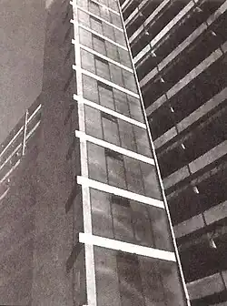 Ta elewacja charakteryzuje się wyraźnymi podziałami w układzie horyzontalnym, narzuconymi przez galerie komunikacyjne i masywne betonowe balustrady tych galerii. Jest ich dziesięć począwszy do pierwszego piętra w wzwyż. Z układem tym zdecydowanie kontrastują dwie wyodrębnione bryły, umieszczone niesymetrycznie względem długości budynku, w które służą komunikacji pionowej dzięki zamontowaniu w nich schodów oraz wind. Obie bryły są przeszklone po stronie zachodniej. Pewnym urozmaiceniem układu są regularnie rozmieszczone wsporniki wysunięte przed lico muru oraz metalowe, pionowe szyny. Ich położenie odpowiada podziałowi na kolejne segmenty mieszkalne. Mają one powtarzalny układ na który składa się wąskie, trójdzielne okno w układzie poziomym zamontowane w 2/3 wysokości ściany oraz obok położone drzwi wejściowe do mieszkania. W parterze znajdują się pomieszczenia gospodarcze, których przednia ściana zewnętrzna wysunięta przed płaszczyznę balustrad galerii komunikacyjnej[24].