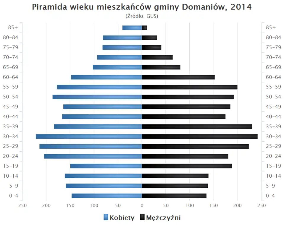 - Piramida wieku mieszkańców gminy Domaniów w 2014 roku[1].