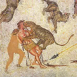 Kara rzucenia zwierzętom na pożarcie, stosowana w Cesarstwie rzymskim wobec kryminalistów. Zaliczano do nich także donatystów, którzy nie wyrzekli się swych praktyk. Mozaika z III w. n.e., Muzeum Al-Dżamm w Tunezji