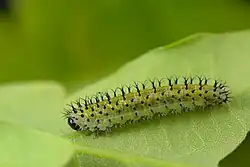 Gąsienice osiągają do 17 mm długości. Ich ciało jest pokryte licznymi, czarnymi kolcami w kształcie litery Y, kolce na dolnej części boków ciała są mniejsze i często bez rozgałęzień. Ubarwienie zielonkawe do żółtego. Głowa czarna[3].