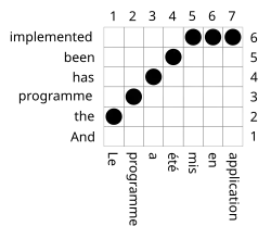 Jest to dopasowanie wyrazów dla tłumaczenia z języka francuskiego na angielski. Powyższy przypadek ma niski poziom komplikacji: jednemu wyrazowi francuskiemu przyporządkowany jest jeden wyraz angielski.