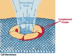Po wytworzeniu C5b przez konwertazę dowolnej z dróg aktywacji dopełniacza, dochodzi do połączenia się C5b z C6. W kolejnym etapie do C5b-6 dołączane są C7 i C8. Powstaje kompleks C5b-8, który ma zdolność włączania się w błonę komórkową i przyłączania kolejnych cząsteczek C9. Przyłączenie 2–14 cząsteczek C9 powoduje utworzenie w błonie komórkowej kanału, którego średnica zależy od liczby wbudowanych C9. Powstanie kanałów powoduje wypływ z komórki jonów, ATP, substancji odżywczych i wielu innych związków, z drugiej strony natomiast do komórki napływa woda (ze względu na wyższe ciśnienie osmotyczne w komórce), mogą się do niej dostawać różne czynniki bakteriobójcze i bakteriostatyczne (np. lizozym) oraz różne leki, na przykład antybiotyki.