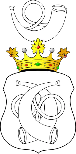 Doręgowski Ib: W polu srebrnym dwie trąby czarne na krzyż, wylotami do góry, skrzyżowane w taki sposób, że przestrzeń między nimi tworzy serce na opak, czerwone. W klejnocie nad hełmem w koronie trąba czarna wylotem w lewo. Labry czarne, podbite srebrem.